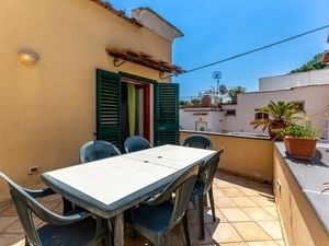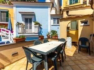 The apartment is on two floors. On the first floor there is a double room with air conditioned, a big bathroom pompeian style with tube, and wardrobe room. On the second floor there is a living room with Tv satellite, a double bedroom with air conditioned, a bathroom with shower, the kitchen and two the terrace sea view .